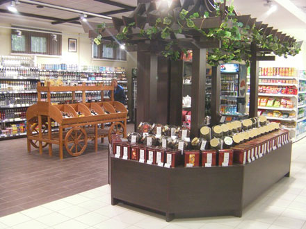Фруктово-овощной, чайно-кофейный, алкогольный и хлебобулочный отделы выполнены в оригинальном стиле с использованием торговой мебели Molinari из экологически безопасных природных материалов.