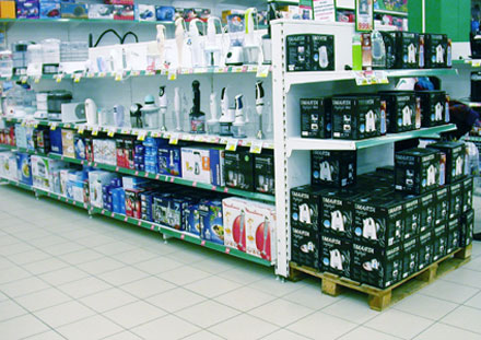 ГК «Витрина» для этого объекта осуществила поставку всего ассортимента торгового стеллажного и сопутствующего оборудования. В магазине установлены стеллажи стандарта «50» (немецкий стандарт оборудования, где «шаг» перфорации в штативах составляет 50 мм), высотой 2300 и 3000 мм. В отделах, где требуются стеллажи с повышенной грузоподъемностью (консервация, пиво-алкоголь, бытовая химия и др), установлены усиленные стеллажи с дополнительной передней стойкой, выдерживающие нагрузку до 2 тонн на стеллаж. В отделах non-food установлены специализированные стеллажи для наиболее эффективной демонстрации товара с учетом его специфики: стеллажи для одежды-обуви, книгопечатной продукции, цветов и т.д.