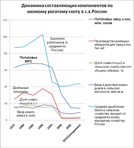 Учитывая зависимость молочного потока от целенаправленной хозяйственной деятельности нашего общества в общем, самое время взглянуть на статистическую динамику за последнюю треть века (см. рис. 3), выведенную автором статьи на единое графическое поле с различными обозначениями ординат исключительно для выявления общей тенденции. Удивительно, но наши органы статистики не разделяют овец и коз, хотя численность коз в девять раз меньше суммарной общей цифры отраженной здесь падающей кривой поголовья мелкого рогатого скота. Жизненным опытом выявлен средний размер дойного стада коз, рассчитанного на получение товарной продукции, в 300-500 голов, с получением молока до 1000-1500 кг в сутки. Если в сельскохозяйственном районе имеется одно-два таких стада, вот вам и оптимальная суточная мощность районного (или кооперативного на паях) молокоперерабатывающего звена.
