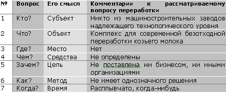 Можно на любом уровне и бесконечно во времени рассуждать о том, как сделать обработку козьего молока адекватной требованиям XXI века. Притом каждая точка зрения может казаться на первый взгляд правильной. Но почти две тысячи лет тому назад римский ритор Квинтиллиан Марк Фабий определил семь вопросов (совокупность точек), при получении ответов на которые информация о явлении, событии, процессе, задаче становится исчерпывающей. На базе его вопросов автором статьи составлена табл. 2.