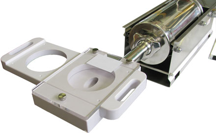 Редуктор имеет два привода отличающиеся передаточным числом. Это позволяет дозировать фарши с различной консистенцией. В комплект поставки шприца включены четыре воронки из нержавеющей стали с выходным диаметром 16, 22, 32 и 38 мм.