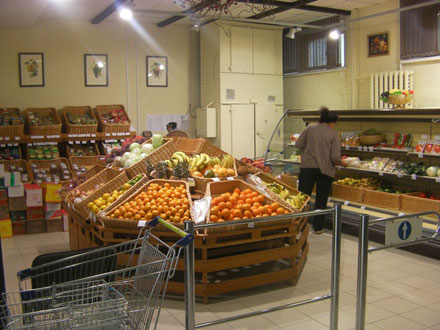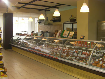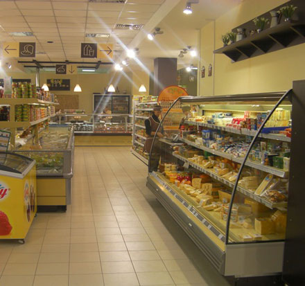 Фруктово-овощной, чайно-кофейный, алкогольный и хлебобулочный отделы выполнены в оригинальном стиле с использованием торговой мебели Molinari из экологически безопасных природных материалов.