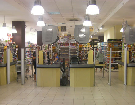 Кассовую зону нового супермаркета составили кассовые терминалы «PRIMA» c транспортерной лентой производства RASEC. Предусмотренная возможность фронтальной посадки кассира служит для оперативности сканирования товарных позиций (в 2 раза быстрее, чем при поворотной посадке), а также для удобства общения с покупателями. Последнее немаловажно, ведь именно кассовая зона считается своеобразной «визитной карточкой» любого супермаркета.