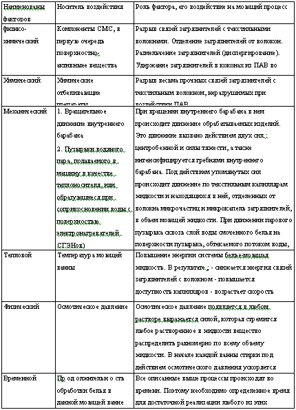 Операция жидкостной обработки, т.е. обработки изделий в водной среде, состоит из двух фаз; стирки и полоскания. Задача стирки состоит в удалении из текстильных или трикотажных изделий различного вида загрязнителей, а также в стабилизации последних, т.е. в их удержании во взвешенном состоянии в моющей жидкости, не допуская ресорбции загрязнителей - их обратного осаждения из моющей жидкости на обрабатываемые изделия. Задача полоскания состоит в удалении из текстильных капилляров неиспользованных компонентов стнрально-моющнх средств (CMC), оставшихся в капиллярах по окончании стирки. При излишне большом остатке в капиллярах CMC, последние оказывают раздражающее, иногда аллергическое, действие на кожу человека. Кроме этого, излишне большое содержание CMC в ткани может вызвать ее пожелтение при глажении. Основные факторы (побудительные силы) стирки, и их роль в моющем процессе приведена в Табл. 1.