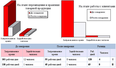 Приведя в примеры внедрения подобной технологии в других компаниях можно определить плановое снижение временных затрат до 70%, а это порядка 128 рабочих дней. Если взять в расчет среднюю выручку небольшого коммерческого магазина и провести расчет по себестоимости персонала нужно отметить, что срок окупаемости данного внедрения от 1-го до полутора месяца.