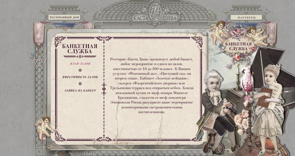 На этот раз проект посвящён ресторану-дворцу «Каста Дива» - это Интернет сайт ресторана, созданный в виде старинной открытки.